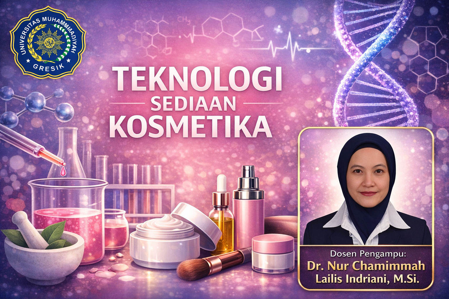 Mata kuliah ini membahas prinsip dasar ilmu kosmetika, mulai dari anatomi dan fisiologi organ target (kulit, rambut, dan kuku) hingga teknik formulasi berbagai bentuk sediaan kosmetik. Mahasiswa akan mempelajari karakteristik bahan baku (zat aktif dan eksipien), metode pembuatan, serta prosedur evaluasi mutu fisik, kimia, dan mikrobiologi sediaan kosmetik. Selain itu, perkuliahan ini mencakup aspek legalitas, penggolongan kosmetik menurut BPOM, serta penerapan Cara Pembuatan Kosmetik yang Baik (CPKB) dalam skala industri maupun skala kecil.